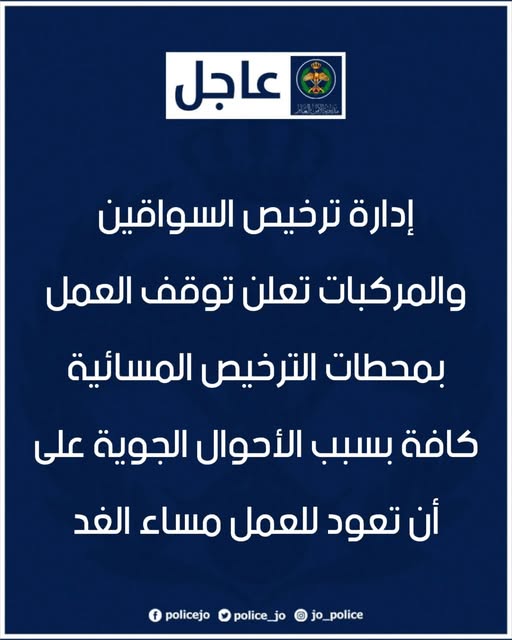 إدارة ترخيص السواقين والمركبات تعلن توقف العمل بمحطات الترخيص المسائية كافّة بسبب الأحوال الجوية على أن تعود للعمل مساء الغد.